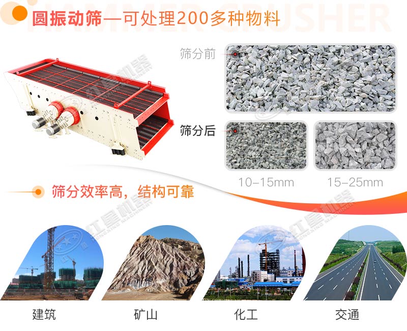 圓振動(dòng)篩圓振動(dòng)篩是一種做圓形振動(dòng)、多層數(shù)、新型振動(dòng)篩。圓振動(dòng)篩采用筒體式偏心軸激振器及偏塊調(diào)節(jié)振幅,物料篩淌線長(zhǎng),篩分規(guī)格多,具有結(jié)構(gòu)可靠、激振力強(qiáng)、篩分效率高、振動(dòng)噪音小、堅(jiān)固耐用、維修方便、使用安全等特點(diǎn),該振動(dòng)篩廣泛應(yīng)用于礦山、建材、交通、能源、化工等行業(yè)的產(chǎn)品分級(jí)。